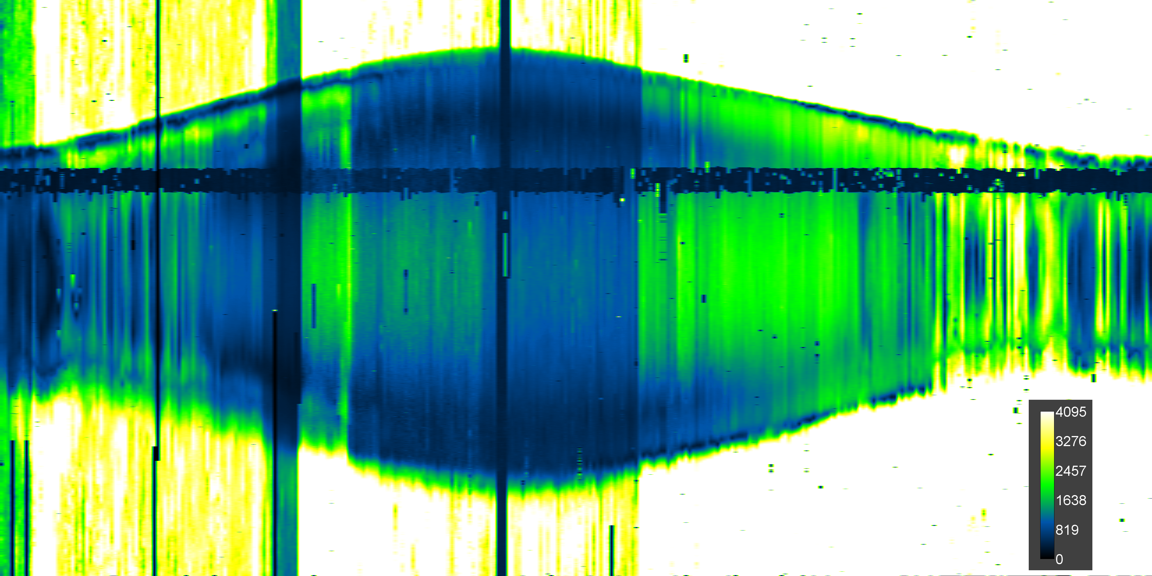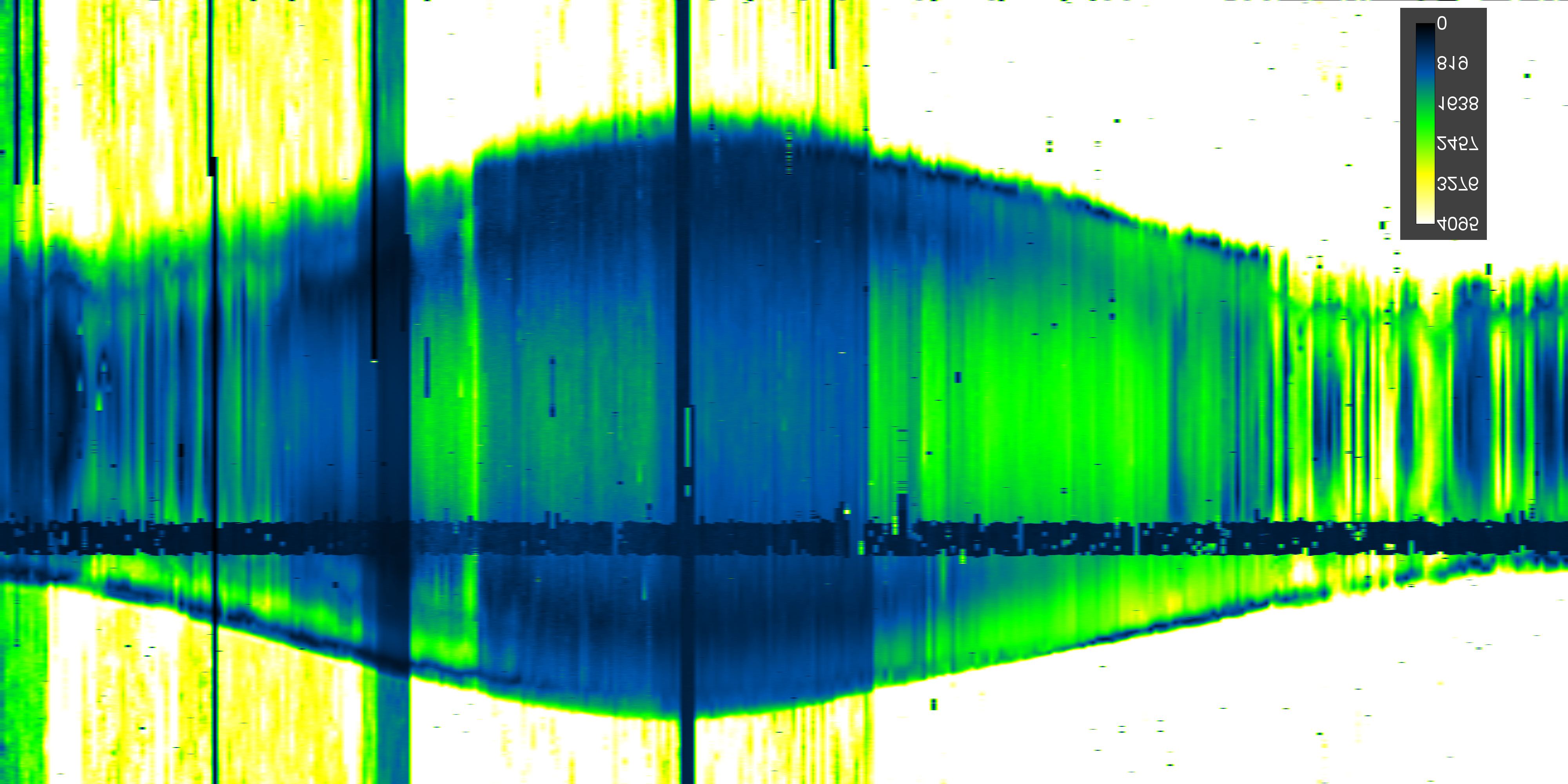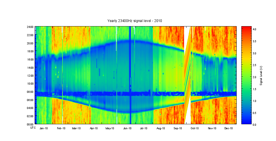 Kde na horizontálnej osi sú vynášané jednotlivé dni v roku, na vertikálnej sekundy dňa a farba podľa kalibračného "stĺpika" určuje intenzitu signálu, ktorú reprezentuje napätie na výstupe prijímača v mV.